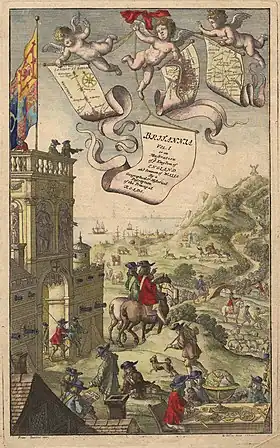 In 1675, John Ogilby (1600–1676) issued his Britannia (also Itinerarium Angliæ), a road atlas depicting in strip form of most of the major routes in England and Wales.[5] The atlas included such details as the configurations of hills, bridges, ferries and the relative size of towns. One hundred strip road maps are shown, accompanied by a double-sided page of text giving additional advice for the map's use, notes on the towns shown and the alternative pronunciations of their name.[6] Another innovation was Ogilby's scale of one inch to the mile (1:63360).[7] These are marked and numbered on each map, the miles further being divided into furlongs.[8] At that period, the measurement of many minor roads had used a locally defined mile rather than the standard mile of 1760 standard yards which Ogilby adopted in his atlas, thus setting the standard for road maps in future.[9]