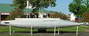 The submarines' hulls were tested to a nominal depth of 100 feet (30.5 m) by filling the hull with water and subjecting it to a pressure of 35 psi (241 kPa; 2 kgf/cm2), but the maximum operational depth was considered to be 50 feet (15.2 m). Nonetheless several boats safely dived to 95 feet (29.0 m) during World War I. It took about three minutes to dive the boat due to the shape of the boat and that it could dive out of control if water was pumped into the ballast tanks too quickly.[5] Submerged endurance was officially considered to be 10 hours, but several boats were submerged for 16 hours during the war.[4]