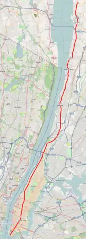 The northwestern corner of the park marks the New York City limit and Broadway enters Westchester County in Yonkers, where it is now known as South Broadway. It trends ever westward, closer to the Hudson River, remaining a busy urban commercial street. In downtown Yonkers, it drops close to the river, becomes North Broadway and 9A leaves via Ashburton Avenue. Broadway climbs to the nearby ridgetop runs parallel to the river and the railroad, a few blocks east of both as it passes St. John's Riverside Hospital. The neighborhoods become more residential and the road gently undulates along the ridgetop.[61] In Yonkers, Broadway passes the historic Philipse Manor house, which dates back to colonial times.[62]