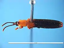 Brontispa longissima (known as the coconut leaf beetle, the two-coloured coconut leaf beetle, or the coconut hispine beetle) is a leaf beetle that feeds on young leaves and damages seedlings and mature coconut palms. It has become an increasingly serious pest of coconuts throughout various growing regions in the Pacific, especially over the last 3 decades,[1] including Indonesia, Solomon Islands, Vietnam, Nauru, Cambodia, Laos, Thailand, Maldives, Myanmar, Hainan Island, and Aru Islands, and most recently, the Philippines.