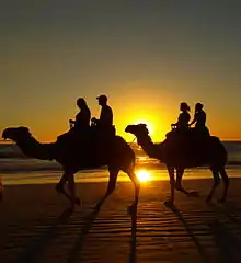 Named for the Java-to-Australia undersea telegraph cable that reaches shore there, Cable Beach is situated 7 km (4.3 mi) from town along a bitumen road. The beach itself is 22.5 km (14.0 mi) long with white sand, washed by tides that can reach over 9 m (30 ft).[3] Located directly east of Cable Beach over the dunes is Minyirr Park, a coastal reserve administered by a collaboration of the Shire of Broome and the Yawuru people.