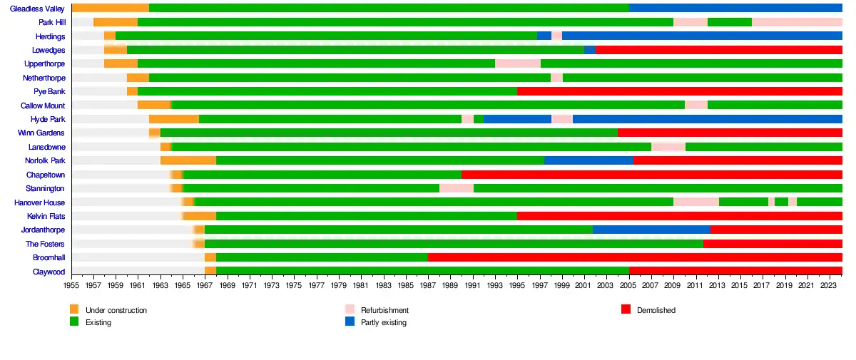 The 1950s and 1960s saw the construction of numerous brutalist apartment blocks in Sheffield, England. The Sheffield City Council had been clearing inner-city residential slums since the early 1900s.[1] Prior to the 1950s these slums were replaced with low-rise council housing, mostly constructed in new estates on the edge of the city.[1] By the mid-1950s the establishment of a green belt had led to a shortage of available land on the edges of the city, whilst the government increased subsidies for the construction of high-rise apartment towers on former slum land, so the council began to construct high-rise inner city estates, adopting modernist designs and industrialised construction techniques,[1] culminating in the construction of the award-winning Gleadless Valley and Park Hill estates.[2]