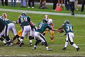 After starting running back LeSean McCoy was ruled out due to post-concussion symptoms, Brown started against the Carolina Panthers on Monday Night Football on November 26, 2012—his first start since high school.[39] Brown had over 100 yards and a touchdown in the first half alone, including a sixty-five yard touchdown run. He finished the game with 178 yards rushing on 19 carries, 2 touchdowns and 4 receptions for 11 yards, and 2 fumbles. Brown's 178 yards set an Eagles rookie record.[40] The next week on December 2, 2012 against the Dallas Cowboys, Brown rushed for 169 yards and two touchdowns. Brown fumbled late in the fourth quarter, however, and Dallas player Morris Claiborne returned the fumble 50 yards for the deciding score in the game.[41]