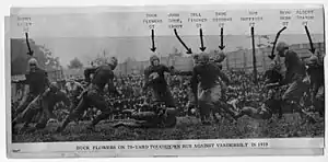 Heisman resigned after the 1919 season. In a 28–0 victory over Clemson, Flowers had a 26-yard touchdown run around left end.[17] Flowers "sidestepped, ducked, twisted and turned until he had again crossed the field almost to the opposite side and then stiff-arming the last man in his way, crossed the goal for a touchdown."[17] A 15-yard pass from Flowers to Bill Fincher netted the third touchdown.[17] Flowers had a 78-yard touchdown against Vanderbilt in the mud.[18]