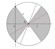 The red and blue needles are both centered at x. The red one falls within the gray area, contained by an angle of 2θ on each side, so it crosses the vertical line; the blue one does not. The proportion of the circle that is gray is what we integrate as the center x goes from 0 to 1