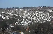 Residential growth continued in the interwar and postwar periods, and the distinctive zonal pattern of development continued. Estates of council housing were built east and northeast of Brighton (at Whitehawk, Bevendean and Moulsecoomb, and in the redeveloped Carlton Hill inner suburb which had been subject to urban renewal); middle-class residential housing developed to the north in the Patcham and Preston areas; and suburbs such as Westdene, Withdean, Tongdean and West Blatchington to the northwest of Brighton and the north of Hove had an upper middle-class character.[57] The rapid interwar suburban growth was similar to that seen throughout southeast England, but it was particularly stimulated by the introduction of electric trains[57] on the main railway route to London—bringing a quicker and much more frequent service and increasing the attractiveness of commuting.[58] Meanwhile, Brighton Corporation began major slum clearance operations in the 1930s when the government offered financial incentives.[59] Moulsecoomb and the Pankhurst Avenue area near Queen's Park, both started in the early 1920s, were the first council estates.[60] In the former, the South Moulsecoomb area was laid out first; its 478 houses, on 94 acres (38 ha) taken from the parish of Patcham in 1920, were designed along "garden city" lines with semi-detached houses set in large green spaces.[61] North Moulsecoomb's 390 houses, including many brick-built terraces at a much higher density, followed from 1926.[62] Brighton's first council flats were the four-storey Milner (1934) and Kingswood (1938) blocks, built as part of the Carlton Hill slum clearance programme.[63]