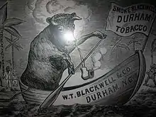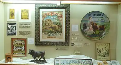 Bull Durham Smoking Tobacco, also known as "Genuine Bull Durham Smoking Tobacco", was a brand of loose-leaf tobacco manufactured by W. T. Blackwell and Company in Durham, North Carolina, that originated around the 1850s and remained in production until August 15, 1988.[1] Over the years, the brand often changed ownership yet continued to be one of the most successful tobacco brands. The brand is most commonly associated with its advertising campaigns. William Thomas Blackwell, an original investor and owner of the Blackwell Company, contributed greatly to the success of the product. Blackwell and his company's tactics with the brand paved the way for other corporations to succeed through the acquisition of the Bull Durham trademark. The success of the product is ultimately due to the successful advertising campaigns that made Durham world famous, brought jobs to the city, and made Durham the tobacco capital of the United States.