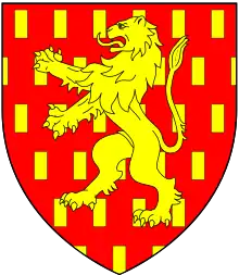 The de Bulmers are thought to have continued as tenants of the Normans who inherited Liulf's land in Yorkshire. At sometime in the twelfth century Ansketil Bulmer is said to have married the daughter of the lord of the manor of Brancepeth near Durham and their son Bertram Bulmer, who succeeded him as Sheriff, inherited this property. Later the Bulmer heiress married into the powerful Norman family of de Neville, who thus inherited Brancepeth Castle and other estates including Raby Castle, the oldest part of which, the Saxon "Bulmer Tower", is inscribed with the initials BB supposed to signify Bertram Bulmer. To memorialise the important marriage, the de Neville family adopted a bull as their canting crest and for their seal. A sculpted escutcheon in the inner gateway of Raby Castle (?) displays a lion rampant, supposed by Surtees (1920)[3] to be the Bulmer arms of Gules billettée or, a lion rampant of the second.[4]