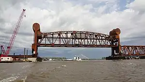 Following the passing of the American Recovery and Reinvestment Act of 2009, and a successful application for federal funding supported by the Coast Guard,[3] the BNSF Railway began work to replace the bridge in late 2009.[4] The project was split into two phases, with the lift span being built first by Ames Construction, of Burnsville, Minnesota, and the approach trusses built by the Walsh Construction Company of Chicago, Illinois. The lift span was complete and operational by February 2011, while the remainder of the bridge was not officially dedicated until October 2012.[5]