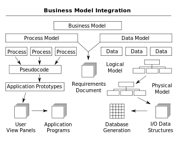 A business model, which may be considered an elaboration of a business process model, typically shows business data and business organizations as well as business processes. By showing business processes and their information flows, a business model allows business stakeholders to define, understand, and validate their business enterprise. The data model part of the business model shows how business information is stored, which is useful for developing software code. See the figure on the right for an example of the interaction between business process models and data models.[26]