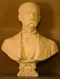 The artist of Daniel W. Voorhees was Daniel W. Voorhees' son, James P. Voorhees (1855–1936). The younger Voorhees spent 21 years as a secretary for his father.[3] After the elder Voorhees' death in 1897, James P. Voorhees completed a bust of his father to memorialize his contribution to the establishment of the Library of Congress,[4] which included planning and championing for the cause as chairman of a Senate committee.[5] The bust was presented to Governor James Frank Hanly (1905–1909) for the Indiana Statehouse.[5]