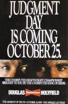 Douglas, however, had other plans and subjected a stunned champion to a severe pounding. Tyson was so unprepared that his corner did not bring proper equipment to the fight, with no ice bag or endswell, and was forced to use a latex glove filled with water to try to reduce the swelling to his eye. Despite being knocked down in the eighth round, Douglas bounced back and knocked Tyson out in the tenth round to claim the title in what was called by Jim Lampley, broadcasting the fight for HBO, as "the single biggest upset in the history of heavyweight championship fights." The fight was not without controversy, however, as Tyson's promoter Don King, claimed that referee Octavio Meyran had not properly counted the knockdown on Douglas from the eighth round (saying that Douglas was down for ten seconds and not the eight count he received), and that the result should be reversed and Tyson should instead be declared the winner. The WBA and WBC initially agreed with King and announced that they would not recognize Douglas as champion until they reviewed the allegations, though the IBF accepted the result as valid.[1] After much public backlash, King rescinded his protest and both organizations officially recognized Douglas as champion.[2] Though Tyson and his camp had hoped for a rematch[3] Douglas ultimately decided to defend his title against the top contender and signed a fight with Holyfield.[4] Prior to the fight, it was announced that Douglas and Holyfield would split a $32,100,000 purse with Douglas guaranteed a then-record $24,075,000, the largest purse ever paid to a single fighter at the time. Holyfield, meanwhile, would earn $8,025,000.[5]