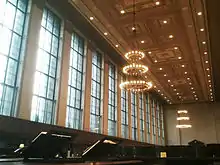 The large mural in the entrance lobby, titled Videbimus Lumen, (based on the university's motto In Lumine Tuo Videbimus Lumen, or In Thy Light Shall We See Light) was painted in 1934 by Eugene Francis Savage. The composition is anchored by the figure of Athena, echoing the large Alma Mater sculpture in front of Low Library in the center of the campus. The mural contains references to light, social struggle, fascism, and the architecture of Columbia and New York City.[16]