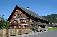 The Bregenzerwälderhaus from the Bregenz Forest in Vorarlberg is an example for a byre-dwelling. The stable and the usually two-storey house are under one roof.[2]