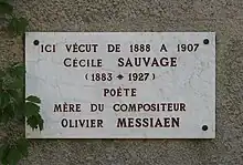 Cécile Sauvage (20 July 1883 – 26 August 1927) was a French poet. She was the author of collections Tandis que la terre tourne (1910) and Le Vallon (1913). Her love poetry was posthumously collected and published by Béatrice Marchal in the volume Cécile Sauvage: Écrits d'amour (2009). Sauvage was the mother of French composer Olivier Messiaen.
