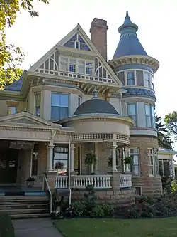 The 2½-story residence featured a balloon frame built on a foundation of locally quarried stone. The interior diameter of the three-story corner tower was 11 feet (3.4 m).[3] The first floor exterior was faced with a light buff sandstone laid in rock-faced broken ashlar with cut stone trim. The second floor was faced with white pressed brick manufactured by the St. Louis Pressed Brick Company. The house was capped with a hipped roof with cross gables and three chimneys. The asymmetrical wrap-around porch featured a turret at its north end and a pediment over its entry from the front walk.