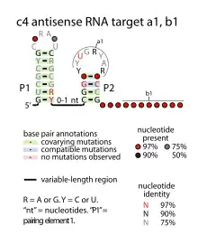 The c4 antisense RNA has two regions, called a' and b' (see diagram), that are complementary to its targets.[2] It has two targets, designated a1, b1 and a2, b2. The a1, b1 site is upstream of the c4 RNA, while the a2, b2 site is immediately downstream of it. The ant gene itself is immediately downstream of the a2, b2 target site. Binding of the a2, b2 site by the c4 antisense RNA represses the ant gene.[2] The function of the a1, b1 site is unknown, but it was suggested that they might compete with the a2, b2 site for binding to c4 RNA.[2]