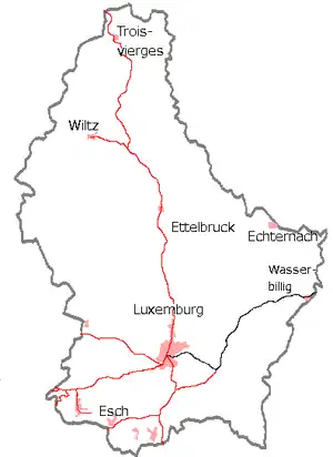 Line 30 is a Luxembourgian railway line connecting Luxembourg City to Wasserbillig, where it runs on the Trier West Railway, connecting to Trier in western Germany. The terminus at the western end is Luxembourg railway station. It is designated and predominantly operated by Chemins de Fer Luxembourgeois.