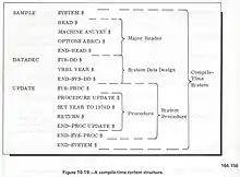 Declarative statements defining the data for a program are grouped into units called data designs. Data designs consist of precise definitions for temporary and permanent data storage areas, input areas, output areas and special data units. The dynamic statements that act on data or perform calculations are grouped into procedures. Data designs and procedures are further grouped to form system elements of a CMS-2 program. The compiler combines system elements into a compile time system. A compile time system may stand alone or be part of a larger program.[1]