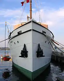 She retired from active service on November 28, 1969, and was transferred to the Bedford Institute of Oceanography (BIO) for use as a museum ship. Acadia was declared a National Historic Site in 1976.[1] On February 9, 1982, the BIO transferred CSS Acadia to the Maritime Museum of the Atlantic for preservation and interpretation. She is moored at the Museum's North Wharf and opens to visitors from May to October. Acadia is known for being one of the last ships in Halifax that was home to an official ship's cat used for rodent control.[7] Acadia is dry docked every five years to preserve her hull, formerly at the Dartmouth Marine Slips and at Halifax Shipyard in more recent years.