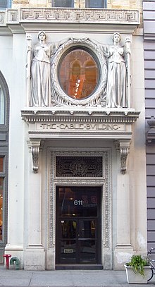 The Real Estate Record and Builders Guide gave special notice to the western entrance, saying: "Surmounting the charming and inviting entranceway is a round ornamental opening, making the centre to a group of two strongly modeled figures, which from their appearance and position are strongly suggestive in many ways of the Great Seal of the Empire State. These figures are 11 feet in height and are worthy of especial notice."[4] Above this entrance are two flanking draped female figures, which were created by the distinguished Scottish-American sculptor J. Massey Rhind the oval window had a large clock in it as shown in photos from ca 1920. Like the architect Stanford White, Rhind was a leader in the "American Renaissance" movement. The figure on the right holds a sword her in hand, the handle of which was broken off ca 1920s, it remained missing for decades until it was replaced incorrectly with a flame torch to match the figure on the left.