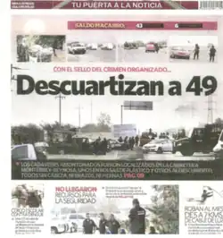 - ↑ Rodriguez, Olga (14 May 2012). "49 headless bodies dumped on north Mexico highway". Yahoo! News. Retrieved 14 May 2012.