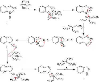 o-nitrostyrene first reacts with triethyl phosphite, and the nitro group is converted to a nitroso group. The nitroso group then reacts with the alkene, and N-hydroxylindole is formed, which reacts again with triethyl phosphite to form the indole.[1][2][3][4]