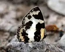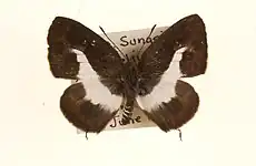 Underside: white with the following black markings: a broad band, broader than in any of the other forms, from base of hindwing produced obliquely across the forewing as far as the discocellular veinlets, thence bent at right angles and extended to the costal margin; beyond this the discal markings on both forewings and hindwings much as in Caleta roxus, but the terminal markings narrow and more or less obsolescent, the apex of the forewing however, is more broadly black, while the subterminal line of linear white spots on the same wing and the transverse subterminal series of black lunules on the hindwing are more or less obsolescent. Antennae, head, thorax and abdomen black; beneath: the shafts of the antennae speckled with white, the palpi, thorax and abdomen with a longitudinal medial white line, the sides of the abdomen barred with white.[2]