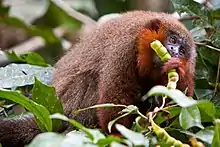 The coppery titi monkey (Plecturocebus cupreus), or red titi monkey,[3] is a species of titi monkey, a type of New World monkey, from South America.[2] They are found in the Amazon of Brazil and Peru, and perhaps northern Bolivia.[2] It was described as Callithrix cupreus in 1823.[2] These monkeys have a lifespan of a little over 20 years.[4] These monkeys eat certain fruits, insects, and plants.[5] They live in monogamous pairs with interesting ways for vocalizing and protecting themselves from predators.