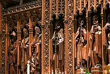 According to Calvary Archives, the Rev. Edwin van Etten, eighth Rector of Calvary Church, chose St. Michael as the patron saint of Calvary in 1923. The twelfth Rector, the Rev. Samuel Shoemaker, reaffirmed this choice in the 1950s. Ever since, St. Michael has been Calvary's patron. Ralph Adams Cram included numerous images of Michael throughout the building. There are at least twelve images of Michael including stained glass windows, statues behind the High Altar and All Saints’ Chapel Altar and War Memorial Cross, to the shield on the Rector’s Chair.[10]