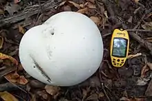 | Giant puffball with a 11.7 x 5.4 cm GPS receiver for scale | |