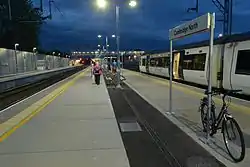 The facilities comprise a 450-square-metre (4,800 sq ft) station building comprising a passenger waiting area, toilets, ticket office, retail and amenity space, and staff accommodation.[40] An overbridge links the building with two 254-metre (833 ft) platforms capable of accommodating 12-car trains.[36] The easternmost platform faces the up line of the Fen Line, while the second platform is an island platform with the down Fen Line on one side and a south-facing bay platform on the other.[36] Two relaid freight lines for Lafarge run next to the bay platform.[36]