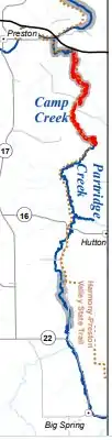 While Camp Creek is located in the Driftless Area, it is flows through fields and does not have significant cliffs along its route. According to the Minnesota Department of Natural Resources, the species present in Camp Creek include: Brown trout, rainbow trout, white sucker, creek chub, slimy sculpin, brook stickleback, longnose dace, blacknose dace, Johnny darter, central stoneroller, bluntnose minnow, and fantail darter. The Root River Trail system follows Camp Creek for much of its extent. A small stream, Partridge Creek enters Camp Creek near State Route 16. Patridge Creek was formerly called Duxbury Creek for the pioneers that settled there.[3][2]