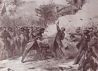 This eventually led to gunfire. Exactly what provoked the shooting remains unclear, but the most common explanation is that a drunkard stumbled into the path of Lyon's marching soldiers and fired a pistol into their ranks, fatally wounding Captain Constantin Blandowski of the 3rd Missouri Volunteer Infantry.[lower-alpha 1] The Volunteers, in reaction, fired over the heads of the crowd, and then into the crowd. Some 28 civilians were killed, including women and children; more than 75 were wounded.[7]