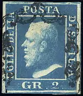 1859 stamp of Sicily with deferential cancellation designed not to deface the "sacred image" of King Ferdinand II[7]