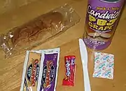 As of November 2011, the only flavor available is "Peanut Butter and Jelly - Grape", although the website claims that "Peanut Butter and Jelly - Strawberry" and "Barbecue Chicken" will be offered.[8] Other potential ideas included pepperoni pizza pocket, French toast, and cinnamon rolls.[5] A can of "Peanut Butter and Jelly - Grape" can contains "a small hoagie roll, a packet of peanut butter, a packet of jelly, a plastic knife and a handi-wipe" and a piece of Laffy Taffy.[8][9] The Candwich had a one year shelf life.[10] As of 2011, the Candwich was available online and at 7-11 stores in Salt Lake City, Utah.[8] Starting September 15, 2016, Candwich could be pre-ordered via a crowdfunding campaign on Indiegogo.[11] In 2021, the Candwich underwent a relaunch, announcing they were now available to purchase from vending machines in the locale.[12] They also rebranded as Mk1 Foods Corp.