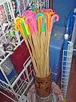 A rattan[40] cane, no more than 12.7 mm (0.5 inches) in diameter[8] and about 1.2 m (3.9 feet) in length, is used for judicial and prison canings. It is about twice as thick as the canes used in the school and military contexts. The cane is soaked in water overnight to make it supple and prevent it from splitting and embedding splinters in the wounds.[37] The Prisons Department denies that the cane is soaked in brine, but has said that it is treated with antiseptic before use to prevent infection.[41] A lighter cane is used for juvenile offenders.[8]