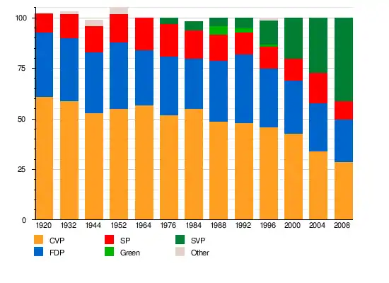 | CVP/PDC/PPD/PCD | Christian democracy | 38.5 | 46.4 | 49.4 | 46.6 | 36.9 | 32.8 | 27.4 | 27.3 | 23.4 | 20.1 | 20.6 | 19.5 | |