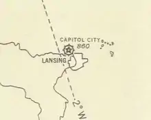 The first planes flew from the site northwest of Lansing on May 1, 1926.[11] The formal dedication of Capital City Airport was held on the weekend of July 14–15, 1928, and was attended by 70,000 people, including arctic explorer George Hubert Wilkins and aviator Carl Eielson. Pilots from Selfridge Field and members of the Michigan National Guard 107th Observation Squadron performed in an exhibition air show.[12] A Stinson Detroiter plane arrived at the airport with Lansing's first air mail delivery on July 5, 1928. Mayor Laird J. Troyer, Chamber of Commerce President Alton J. Hager, and airport committee chairman Clyde B. Smith, among others, were present to witness the plane's arrival.[13] Regular cargo service from Capital City Airport began on July 17, 1928, via Transamerican Airlines. That day pilot C.V. Pickup departed with five sacks of mail en route to New York City. Lansing postmaster Walter G. Rogers was among those present to witness the event.[14]