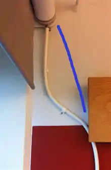 An example of when knowledge of the capstan equation might have been useful. The bent white tube contains a cord to raise and lower a blind. The tube is bent 40 degrees in two places. The blue line indicates a more efficient design.