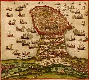 The Spanish fleet set sail to Mahdia on 24 June and arrived there four days later. The city was defended by the nephew of Turgut Reis, Hesar, who had spent two months locking cattle and storing rice and beans enough to feed the city for a year, in anticipation of being under siege.[5] The landing of the Spanish troops took place under the protection of the galleys' cannons and out of Mahdia's gun reach.[7] Within hours the Ottoman infantry and cavalry were driven out of a hill they occupied, and to the next day the city was completely surrounded by trenches dug six hundred meters from the walls.[7] Luis Pérez de Vargas, mayor of the castle of La Goulette, who was in command of the Spanish artillery, ordered to install several heavy pieces on the hill occupied the previous day to cover the locations of the 18 lighter pieces that had detached to beat the walls.[7] The same day the first assault was launched, but it was repelled because the moat had not been filled.[7] Despite advancing the artillery close to the walls and improving the trenches, the besiegers, harassed continuously by sallies of the Ottoman garrison, did not make significant progresses in the following days.[7]