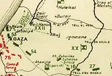 After the capture of Beersheba on 31 October by General Edmund Allenby's forces, between 1 and 7 November strong Ottoman rearguards at Tel el Khuweilfe in the southern Judean Hills, at Hareira and Sheria on the maritime plain, and at Gaza close to the Mediterranean coast, held the Egyptian Expeditionary Force (EEF) in heavy fighting. Towards the end of the week the Ottoman Army was able to withdraw mainly at night in good order, under cover of effective rearguards.[1] The Ottoman XXII Corps had not been defeated at Gaza, but conducted a skillful, tactical retreat from the town, demonstrating both operational and tactical mobility.[2] The Gaza garrison withdrew in three detachments, the Ottoman 53rd Division moved eastwards, delaying the pursuit by Desert Mounted Corps, the Ottoman 3rd Division occupied a strong rearguard position at Beit Hanun, while the Ottoman 7th Division established the Wadi el Hesi line of defences.[3] However, in conjunction with the captures in the centre of the line at Sheria, the occupation of Gaza enabled a swift direct advance northwards, preventing a strong consolidation of the Wadi el Hesi rearguard position.[4] This wadi was the second of the major watercourse on the Palestine coast, flowing parallel with, and 12 miles (19 km) north of the Wadi Ghuzzee.[5][6]