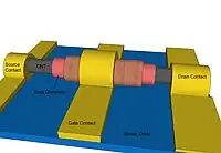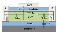 A carbon nanotube field-effect transistor (CNTFET) is a field-effect transistor that utilizes a single carbon nanotube (CNT) or an array of carbon nanotubes as the channel material, instead of bulk silicon, as in the traditional MOSFET structure. There have been major developments since CNTFETs were first demonstrated in 1998.[1][2]