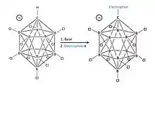 While the C-vertex of the boron-based anion can de deprotonated and furthermore react with electrophiles, the B–Cl vertices remain substantially inert.