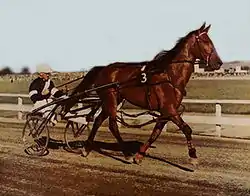 April 1966 saw Cardigan Bay sweep all three legs of the International Pacing Series, the International Pace, Good Time Pace and National Championship Pace at Yonkers Raceway. It was the first time a horse had won all three legs.[9] Perhaps his most famous encounter was with the great Standardbred horse, Bret Hanover, in the Pace of the Century, in 1966. Cardigan Bay, with Stanley Dancer driving, won that race in front of 45,000 spectators at Yonkers Raceway and became only one of two horses (the other being Adios Vic) up to that time to have beaten Bret Hanover. However, in their next encounter at Roosevelt Raceway, the "Revenge Pace," Bret Hanover reversed that result with Cardigan Bay third before a crowd of 37,000.[10]