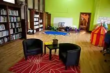 The Carnegie foundation provided a grant of $357,782 for its construction.[8] (This figure is believed to reflect the total of the 1889 and 1893 structures). Like some of the other early Carnegie libraries, the building housed various recreational facilities for its users, including billiard tables on the first floor. (Carnegie was himself quite fond of billiards, which was quite fashionable at the time.[9]) A bathhouse in the basement, originally accessed by a tunnel under the front entrance, provided Carnegie's millworkers with a place to shower (at a time when indoor plumbing was not the norm) before using the facilities. Now re-purposed as a pottery studio, the tiled walls and floor remain, suggesting its original purpose.