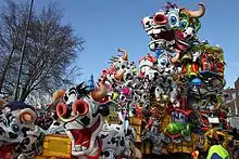 In many places, large carnaval parades are held with large floats, organized and created by the carnaval associations. These are called D'n Optocht or D'n Boonte Störrem (The Motley Storm). The parades have usual a particular theme whereby authorities are ridiculed and criticized, events of the past year are represented and which are often politically incorrect and used to make people think outside the box or function as a mirror to the society. Also groups or individuals on foot will participate and fill the gaps between the carnaval wagons during the parade. Fanfares and marching bands will provide for typical carnaval music. The floats are built by carnaval associations, but also often by independent groups of friends, families, neighbourhoods or other clubs. A massive ship-looking wagon is shown in every carnaval parade which is manned by the prince, his entourage and the council of eleven of the city it is held or of the carnaval association that organized the parade and is usually the last float at the parade. Carnaval parades often start at 11.11 am and end early in the afternoon. Some wil start in the afternoon to give participants the opportunity to join several parades a day and to give the public and participants the opportunity to be somewhat more sober / less hangover after the drinking of the day before. In that case they will start at 11 past the hour as well. Usually a competition will be held to choose the most outstanding contribution to the parade with separate categories for floats, groups on foot and individual participants. Although a procession usually takes from a starting point to a point of arrival, it actually roams from nowhere to nowhere. What only matters is the social binding during the parade. Along the route, the crowd forms a very essential part of the parade. The crowd is not just spectator, they form living dikes along the carnaval river without which the parade would lose meaning.[1]