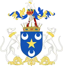 These were the primitive arms of the Carpentier family as well as the arms of the Carpentier Baronets, of France : Azure, a chevron or between three crescents argent.[1]