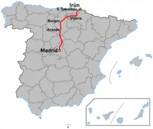 Most of the route has now been replaced by the Autovía A-1 and Autopista AP-1. The A-1 starts at Madrid then goes to Burgos. N-I then runs parallel to AP-1 (toll highway) to Miranda de Ebro. It becomes again A-1 and goes via then goes via Vitoria, Altsasu (Alsasua), Beasain, Tolosa, Donostia and Irun.