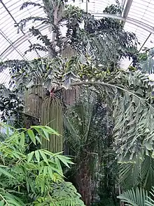 Caryota rumphiana, whose common names include the fishtail or Albert palm, is a Caryota or fish tail palm (Family Palmae or Arecaceae). It is native to Philippines, Sulawesi, Maluku, New Guinea, Solomon Islands, Bismarck Archipelago.[1][2][3][4][5] Its leaves have a distinctive fishtail shape and its flowers have been described as mop-like. It is monocarpic. These leaves are bipinnate with as many as 1,800 fan-shaped or wedge-shaped leaflets, each up to 15 inches (38 centimeters) long by six inches (15 cm) wide.[6]